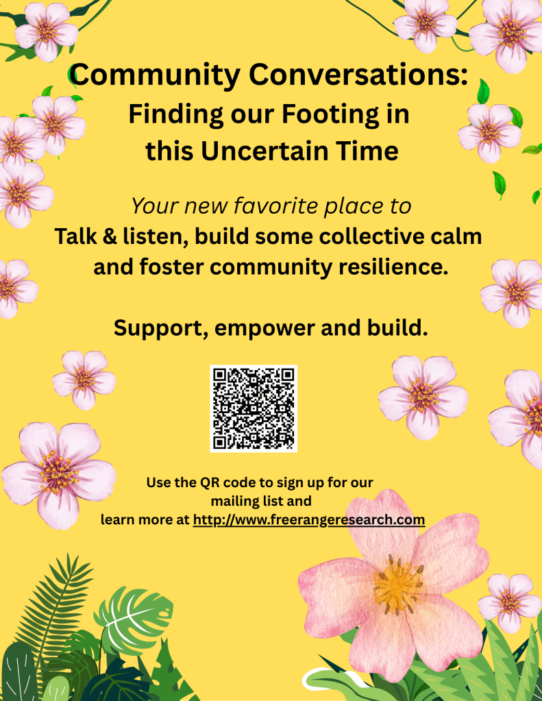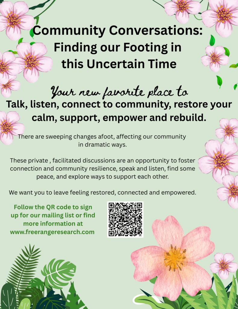 In 2025, I began a series of community-building events called ‘Community Conversations: Finding our Footing in this Uncertain Time.’ The events have been held in conjunction with a variety of different types of groups as well as for the general public.