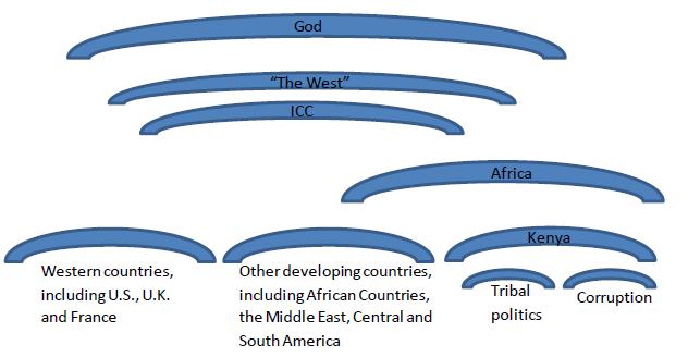 Once this framework was built, I looked closely at the ways in which participants used this framework. Sometimes participants made distinct discursive moves between these levels. But when I tried to map the participants’ movements on their individual diagrams, I noticed that my depictions of their movements rarely matched when I returned to a diagram. Although my coding of the framework was very reliable, my coding of the movements was not at all. This led me to notice that oftentimes the frames were being used more indexically. Participants were indexing levels of the frame, and this indexical process created powerful frame shifts. So, on the level of Kenyan politics exclusively, Uhuru’s crimes had one meaning. But juxtaposed against the crimes of other national leaders’ Uhuru’s crimes had a dramatically different meaning. Similarly, when the legitimacy of the ICC was questioned, the charges took on a dramatically different meaning. When Uhuru’s crimes were embedded in the postcolonial East vs West dynamic, they shrunk to the degree that the indictments seemed petty and hypocritical. And, ultimately, when religion was invoked the persecution of one man seemed wholly irrelevant and sacrilegious.